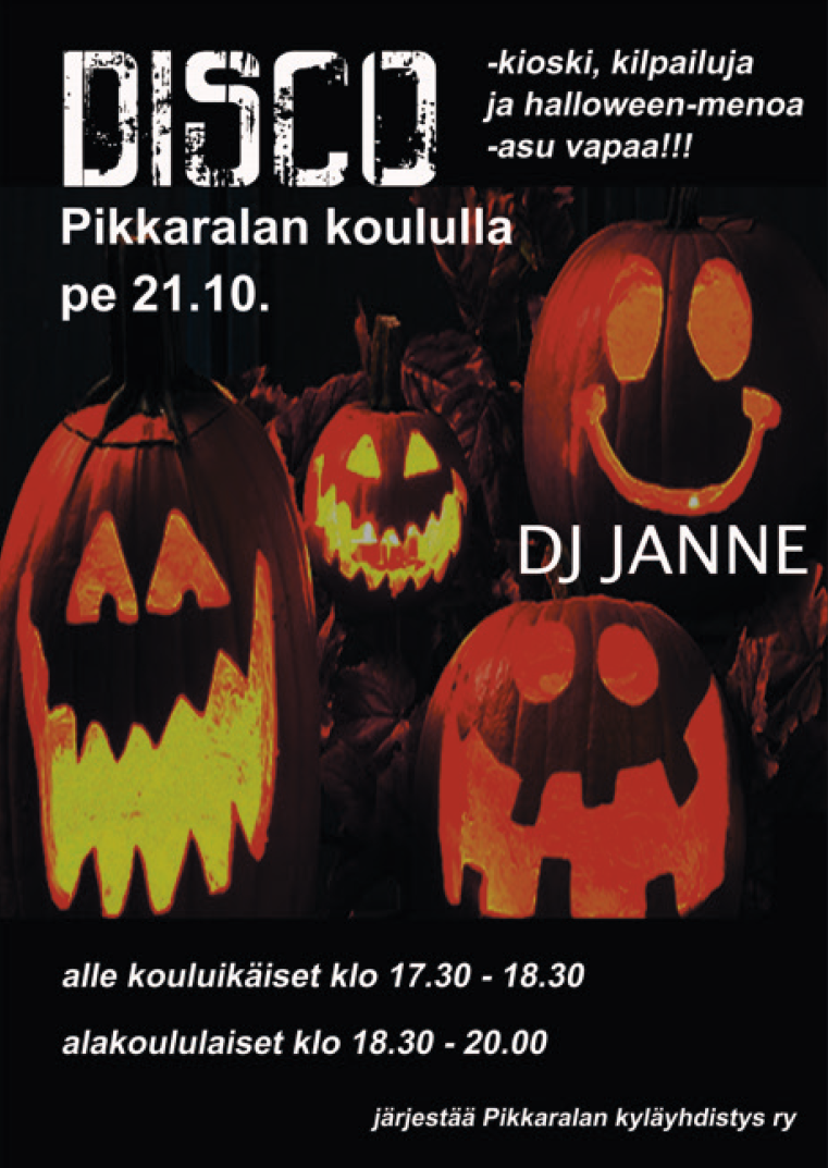 Disco perjantai 21.10. klo 17.30-18.30 alle kouluikäiset, 18.30-20.00 alakouluikäiset.