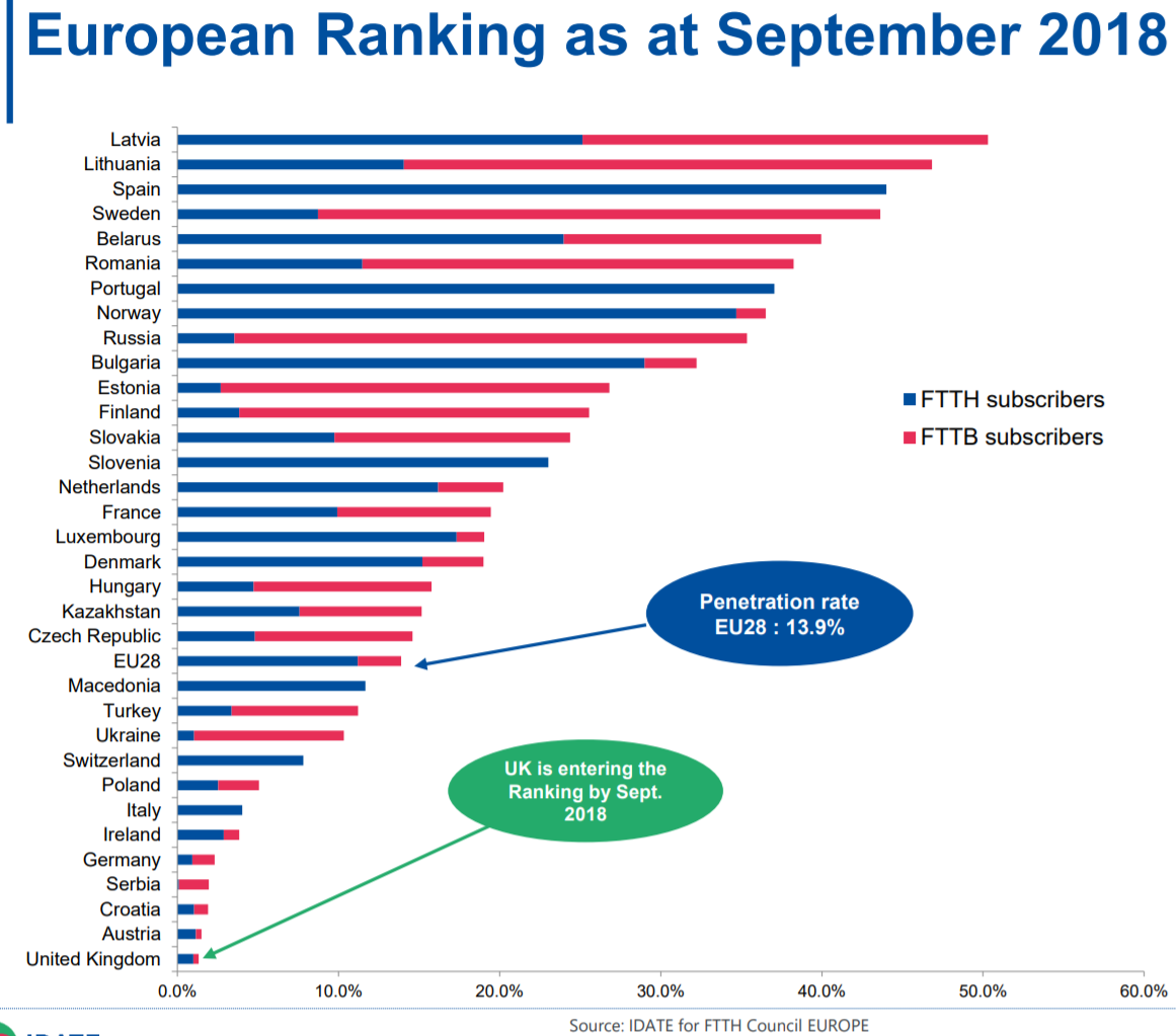 Koko Suomen tasolla tilanne näyttää todella huonolta valokuidun suhteen verrattuna muuhun Eurooppaan vuonna 2018. Alla Euroopan valokuituliittymien määrä talouksissa. Sininen palkki FTTH (Fiber-To-The-Home) tarkoittaa aitoa suoraa valokuituliittymää talouteen ja punainen FTTB (Fiber-To-The-Building) tarkoittaa valokuitu rakennukseen, josta se sitten jaetaan esimerkiksi kerrostaloasujien kesken. Eli kuvasta pitää tarkastella nimenomaan sinistä palkkia. Suomella se on ollut vain n. 5% vuonna 2018, esimerkiksi Espanjassa luku on ollut 45%. Huomattavaa ja hieman erikoista on, että perinteiset varakkaat läntiset teollisuusmaat, kuten Saksa ja Englanti laahaavat pahasti jäljessä. Kun taas esimerkiksi Portugalissa on ollut lähelle 40%:n penetraatio, Bulgariassa 30% ja Valkovenäjälläkin 25%. Kehitetäänkö nopeaan laajakaistaan perustuvat sovellukset jatkossa noissa maissa?