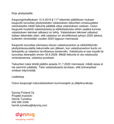 Oulun kaupunki aikoo ulkoistaa myös katuvalojen ylläpidon yksityisteiden eli tavallisten ihmisten harteille (kirje alla, klikkaamalla suurentuu). Tiekunnan tulisi päättää tästä 15.8.2020 mennessä. Mitä mieltä olette? Laittakaa kommenttia kommettikenttään.